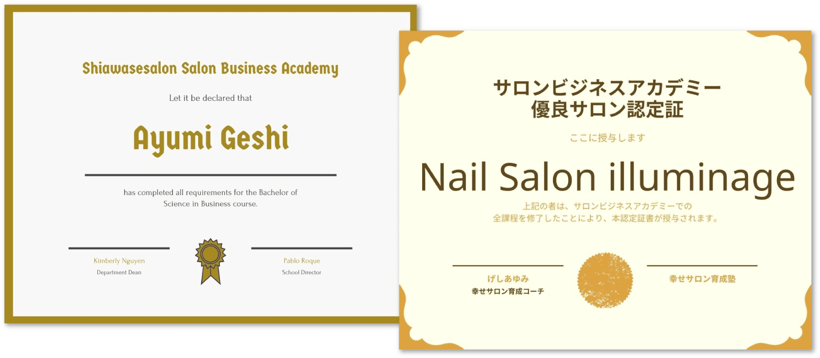 集客・リピート・スタッフ育成・カウンセリングにおいて優良な経営をしているサロンとしての認定証をサロンビジネスアカデミーから発行します。新規集客やブランディングで他店と差別化ができて有利です。